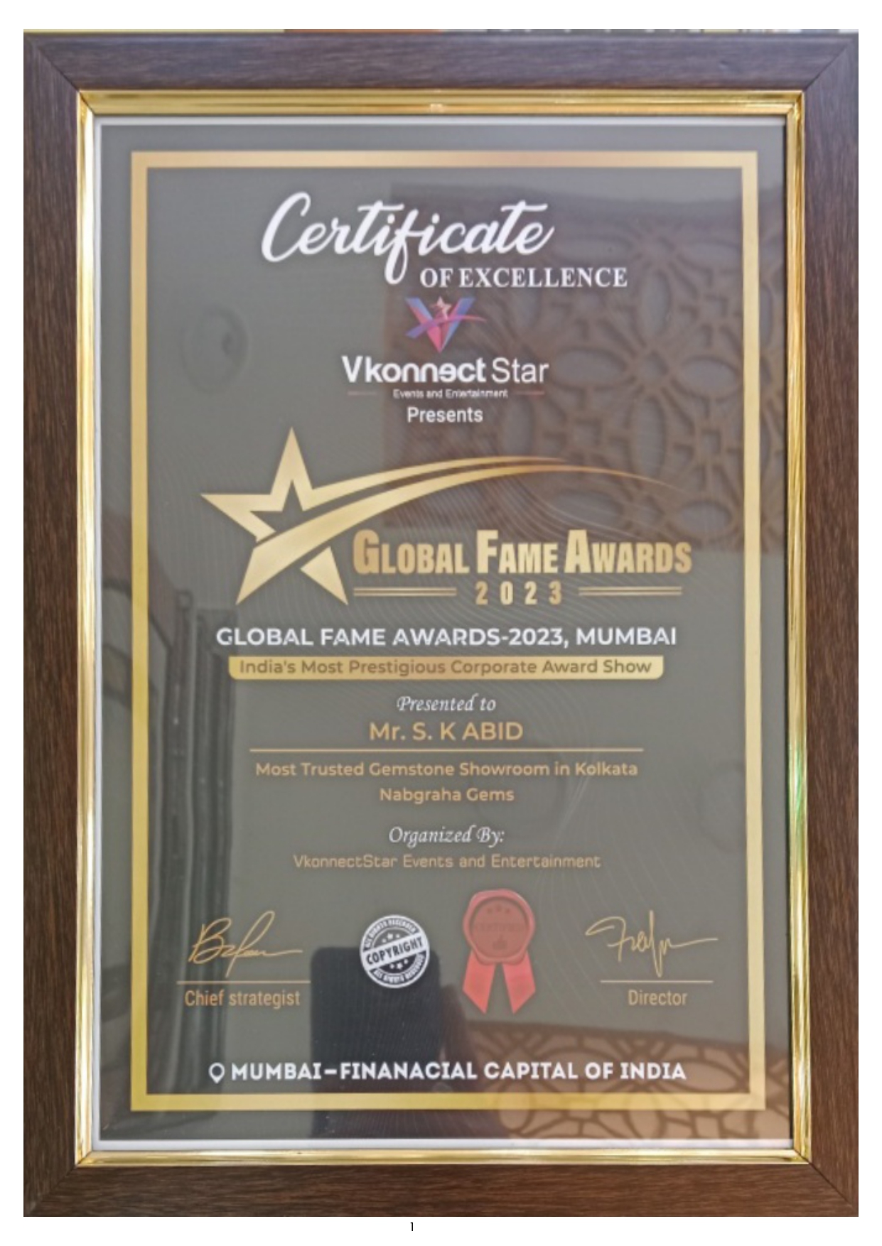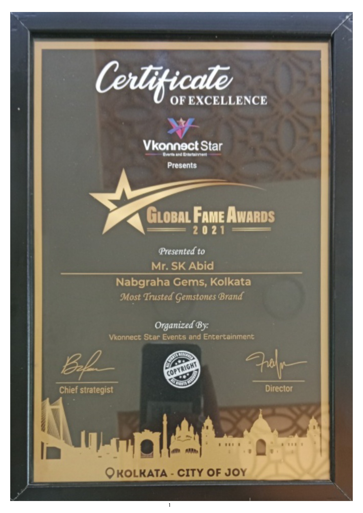 Awarded As Most Trusted Gemstone Showroom In Kolkata Thrice By Global Fame Awards.