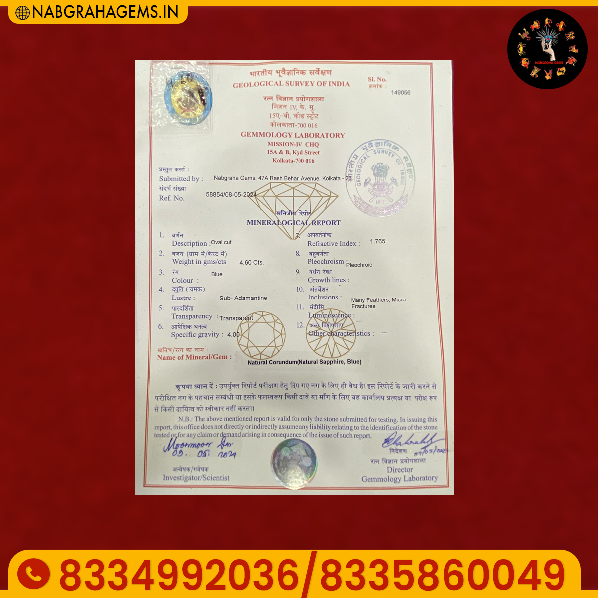 NOTE: GEM TESTING CERTIFICATE WILL BE PROVIDEDTO CUSTOMERS.