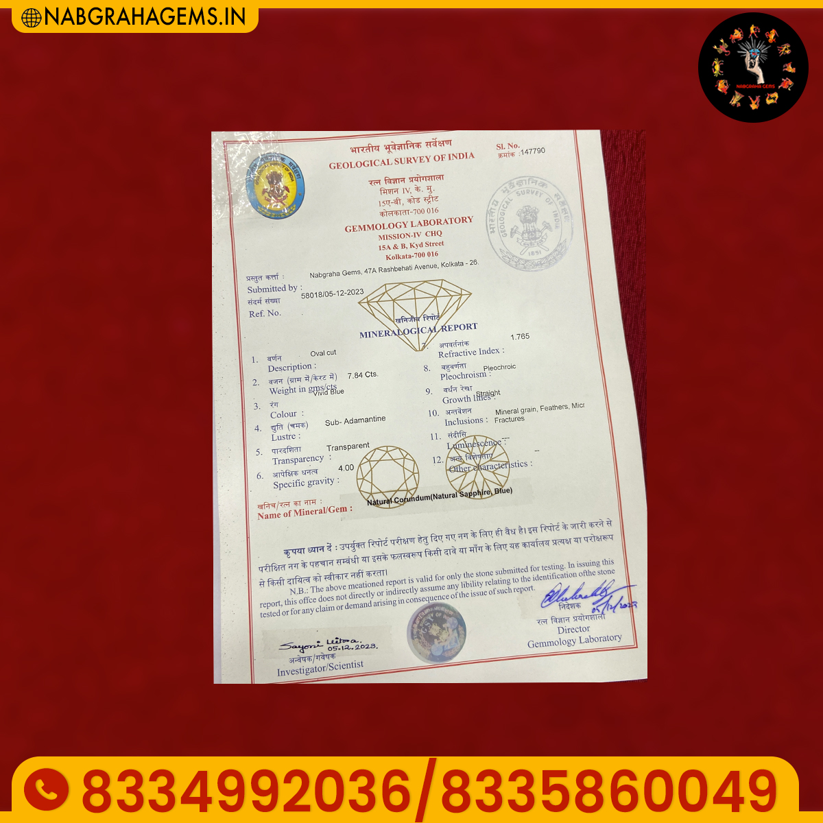 NOTE: GEM TESTING CERTIFICATE WILL BE PROVIDED
